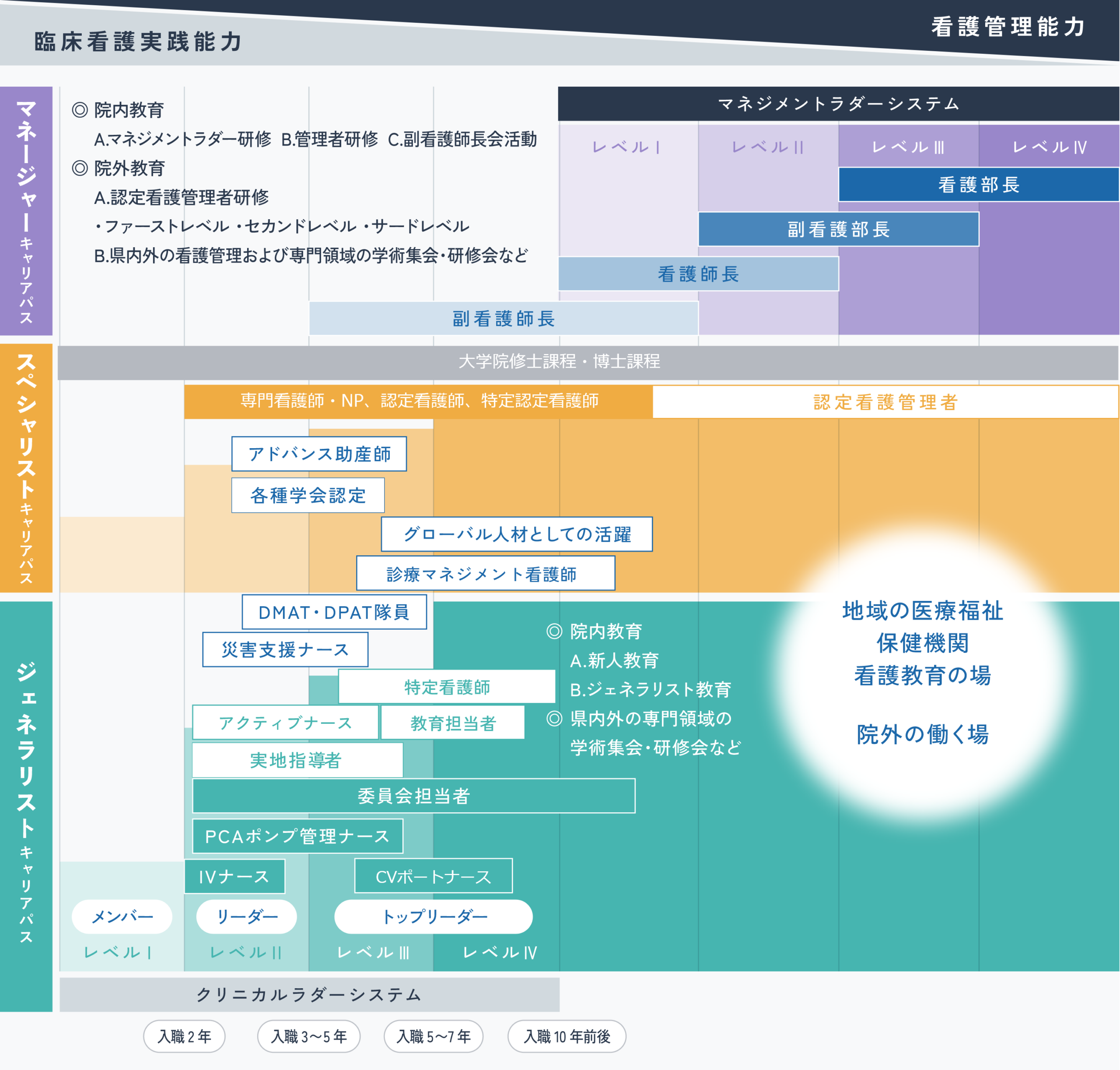 特定機能病院である当院の高度かつ先端的な医療の提供に貢献するだけでなく、地域における看護の質向上や看護職の育成にも繋げることを視野に入れた、看護職の能力開発の道筋をキャリアマップで示しています。