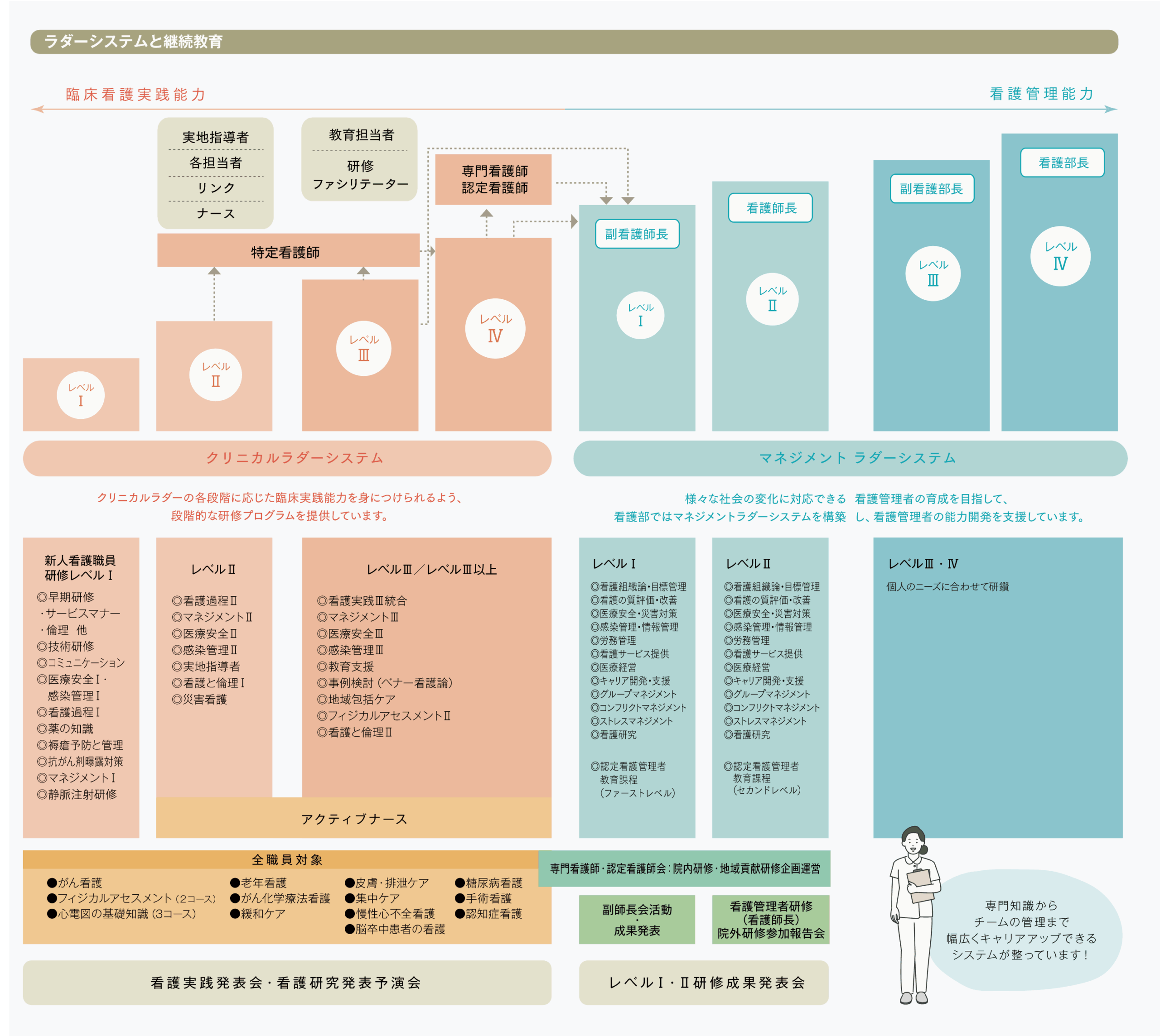 当院では、日本看護協会の提唱するクリニカルラダーシステムおよびマネジメントラダーシステムに準拠した教育を採用しています。